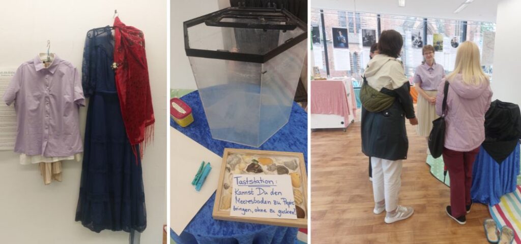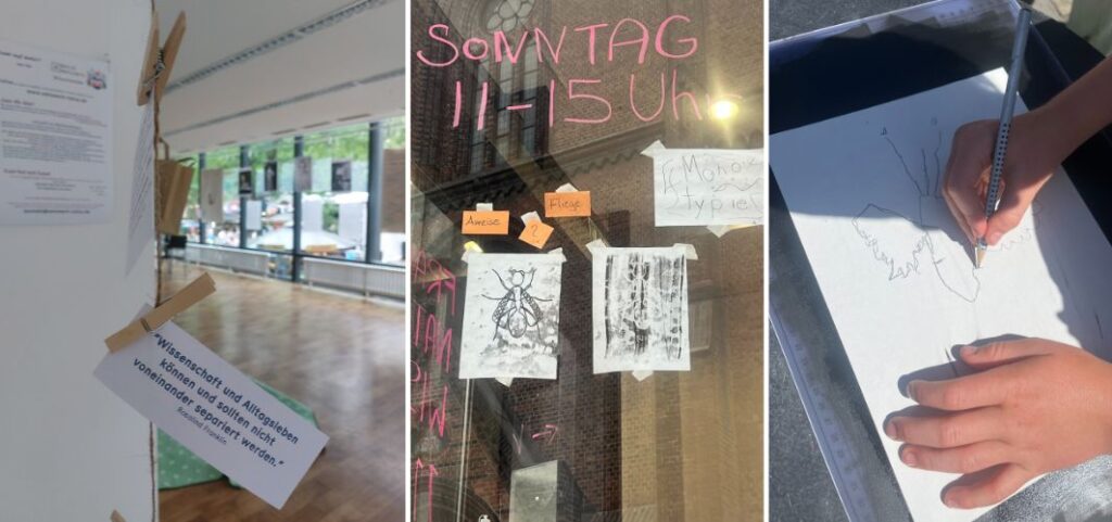 “Lebendig” wurde das Museum durch zahlreiche Anreize zum mündlichen wie schriftlichen Austausch, Feedback, und insbesondere auch zwei lange Austauschrunden (am Fr.27.06. mit den „Frauen der Informatik“ von der Uni Kiel und am Sa.28.06. angeregt von den Fragen eines Studenten zur Wissenschaftlerin Amalie Dietrich), sowie durch einen Workshop, durch vier Theaterszenen, und durch diverse Kreativwerkstätten, in denen die Fachinformationen u.a. auch durch sinnliche Eindrücke ergänzt und non-verbal neu ausgedrückt werden konnten.